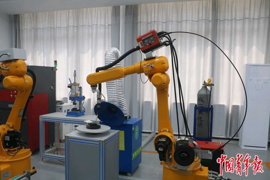安徽机电职业技术学院智能产线上的焊接机器人。中青报·中青网记者王海涵/摄